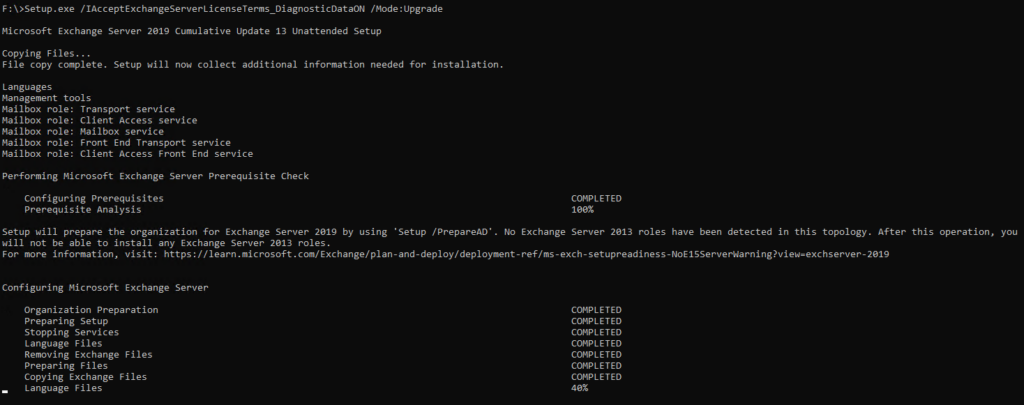 Setup.exe /IAcceptExchangeServerLicenseTerms_DiagnosticDataON /Mode:Upgrade