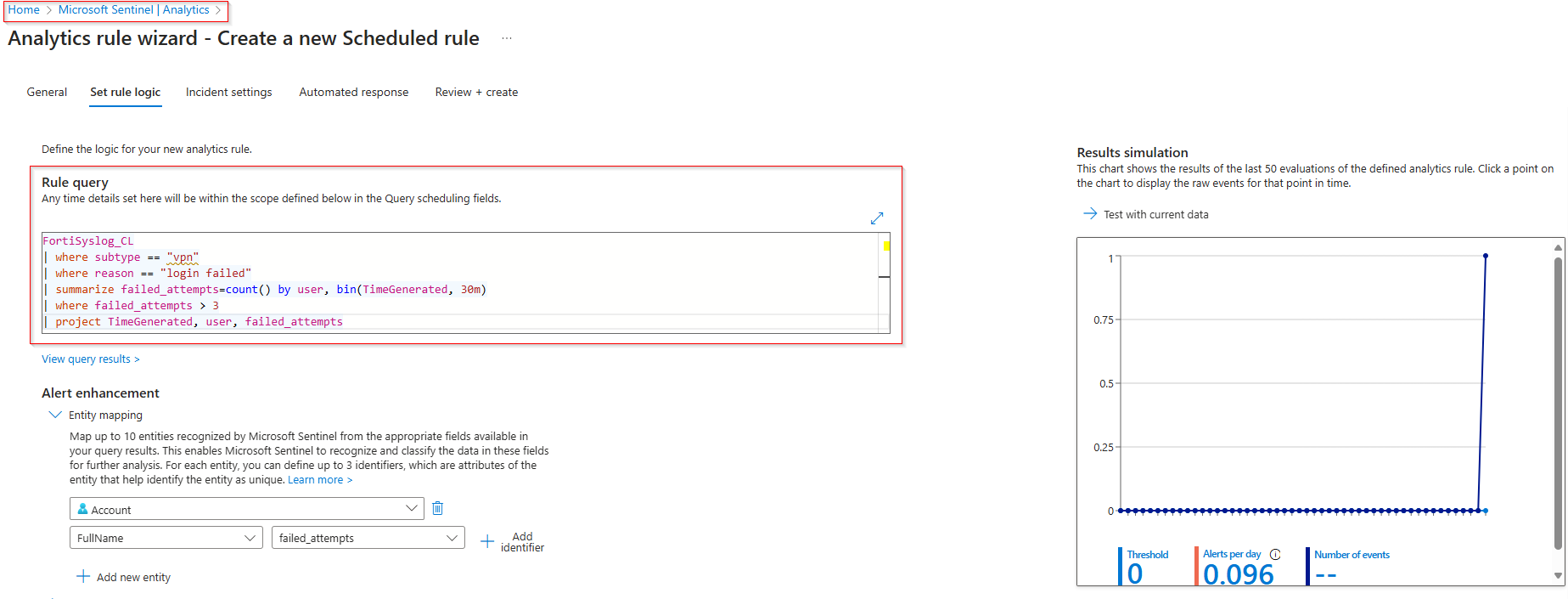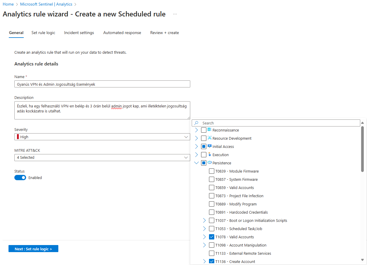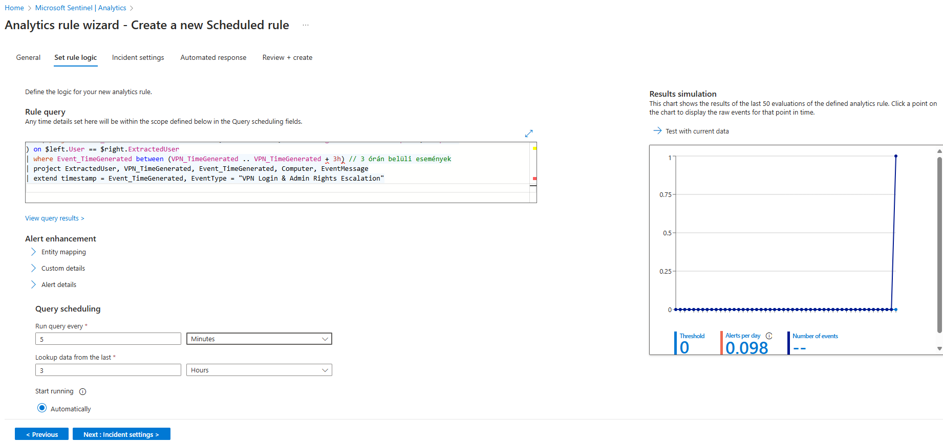 Ha riasztásokat szeretnél generálni bizonyos gyanús VPN eseményekre, hozz létre egy Custom Analytic Rule-t Sentinelben.