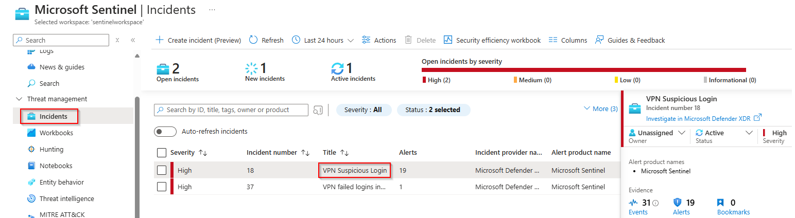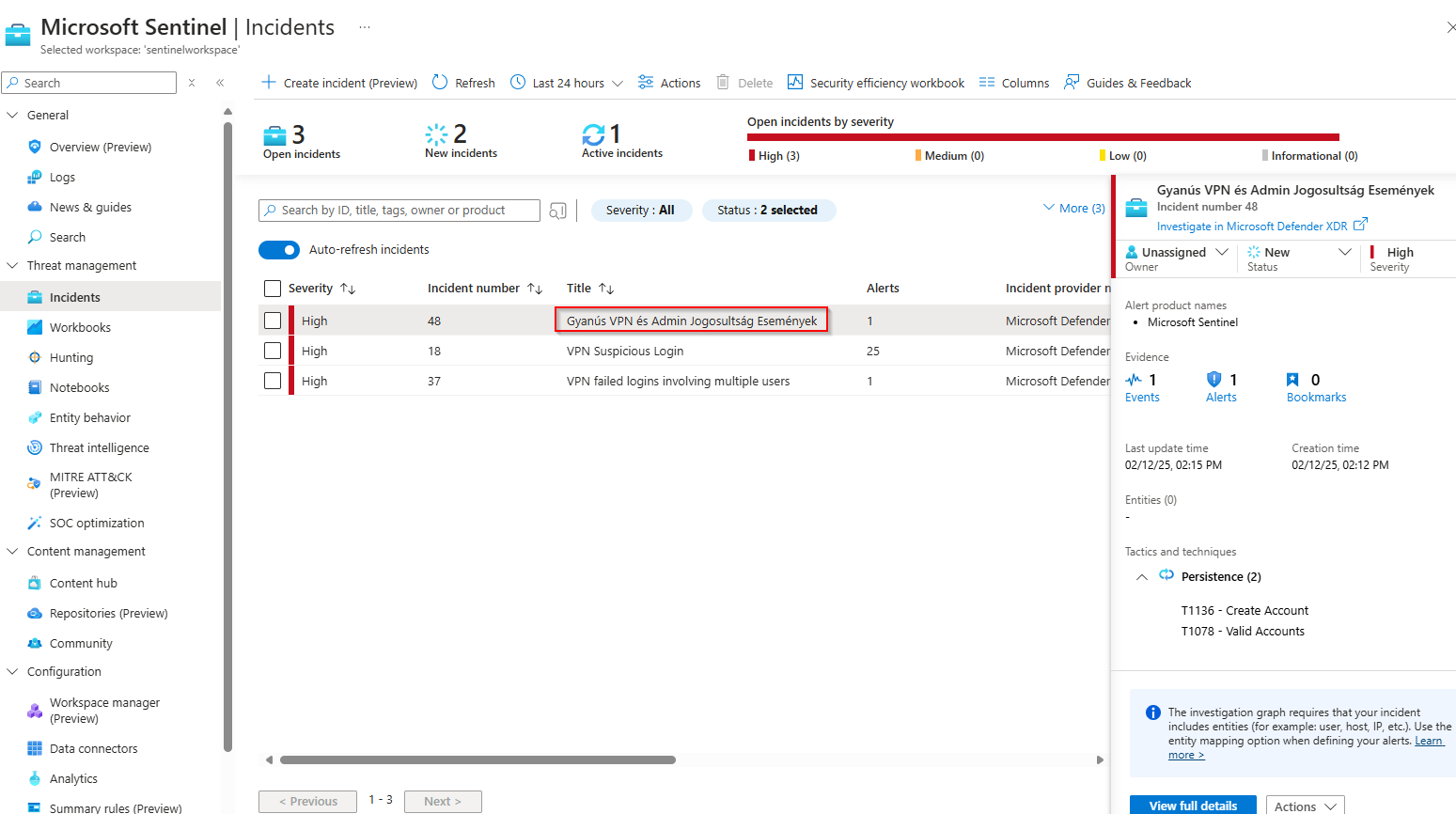 Tehát létrejön a Custom Analytic rule alapján az incidens (VPN Suspicious Logins – VPN failed logins – tesztemben ezt véletlenül több néven is létrehoztam de ugyan arra az eseményre jön létre):
