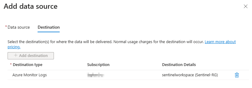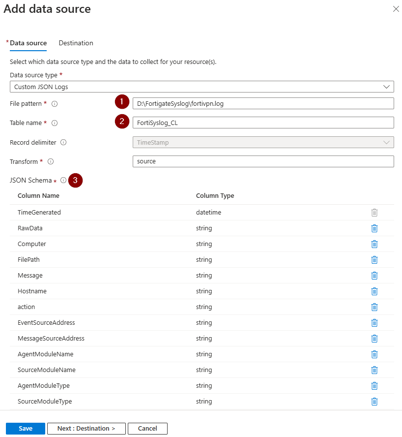 2 – Megadjuk az adattábla nevét a Sentinel workspace-n ahová kerül a log