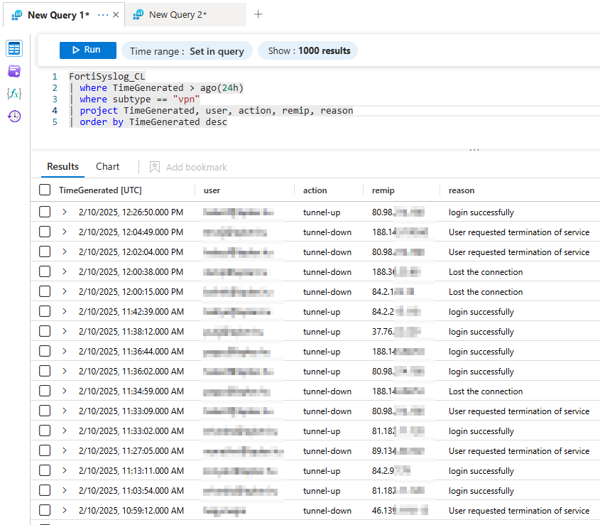 ✔ A FortiSyslog_CL táblából szűri a VPN eseményeket (subtype == "vpn").