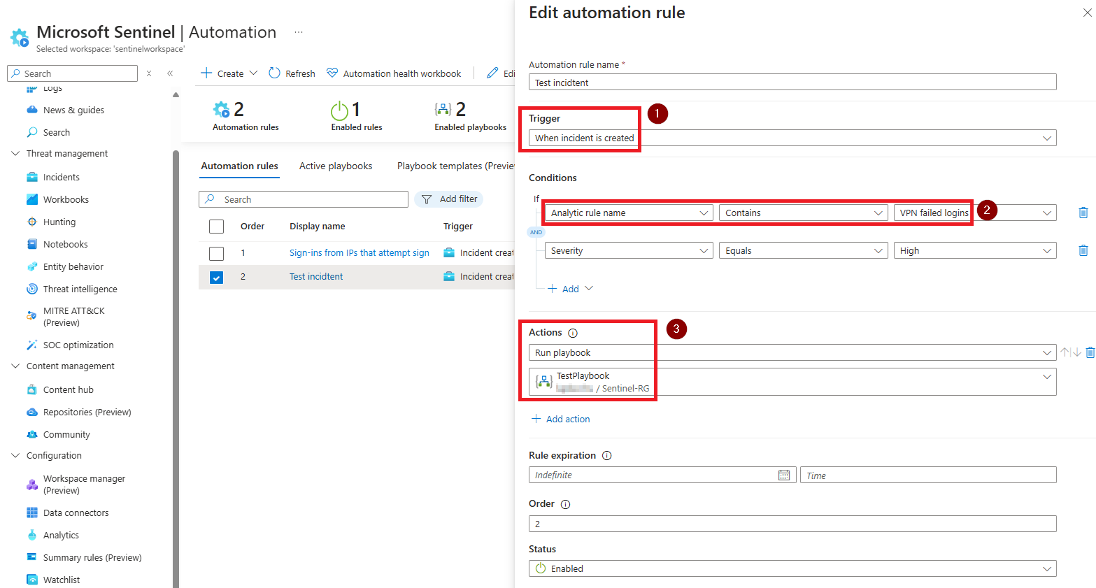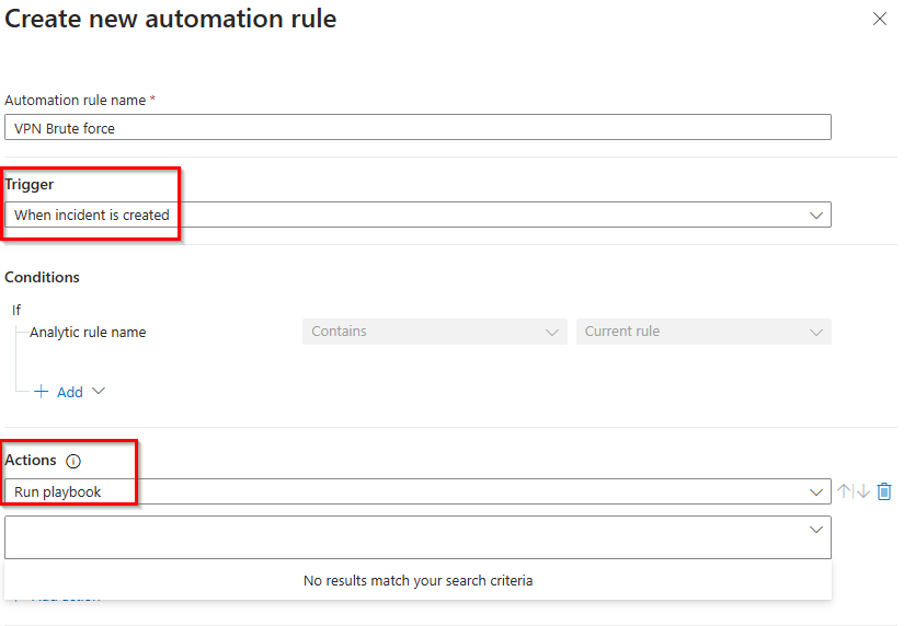 Ebben a szakaszban lehetőség van automatikusan incidens generálására, valamint egy Playbook futtatására, például az Entra-felhasználó letiltására. Jelenleg még nincs előre definiált válaszreakció, de a későbbi tesztesetek során ezt is bemutatom.