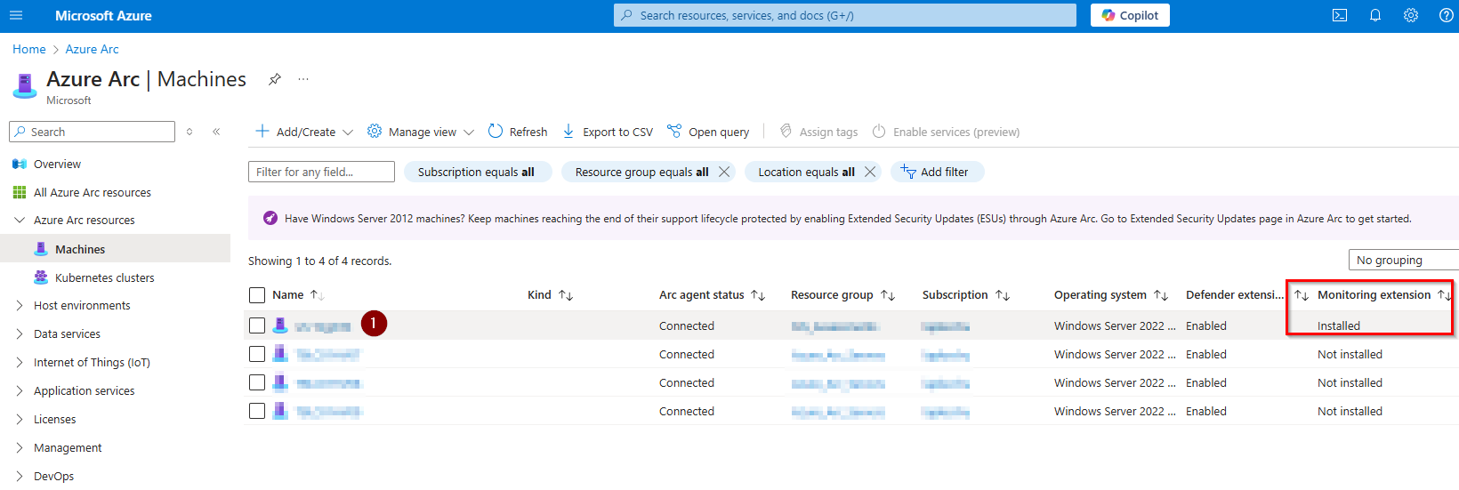 Azure Arc-ba bevont földi (on-premise) szerveren van a fenti Syslog fájl – A Monitoring Extension modulnak telepítve kell lennie: