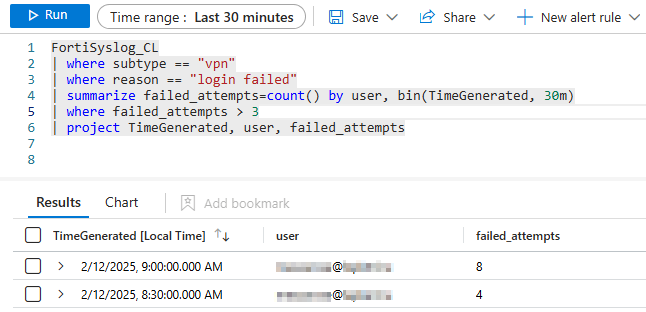 | summarize failed_attempts=count() by user, bin(TimeGenerated, 30m)