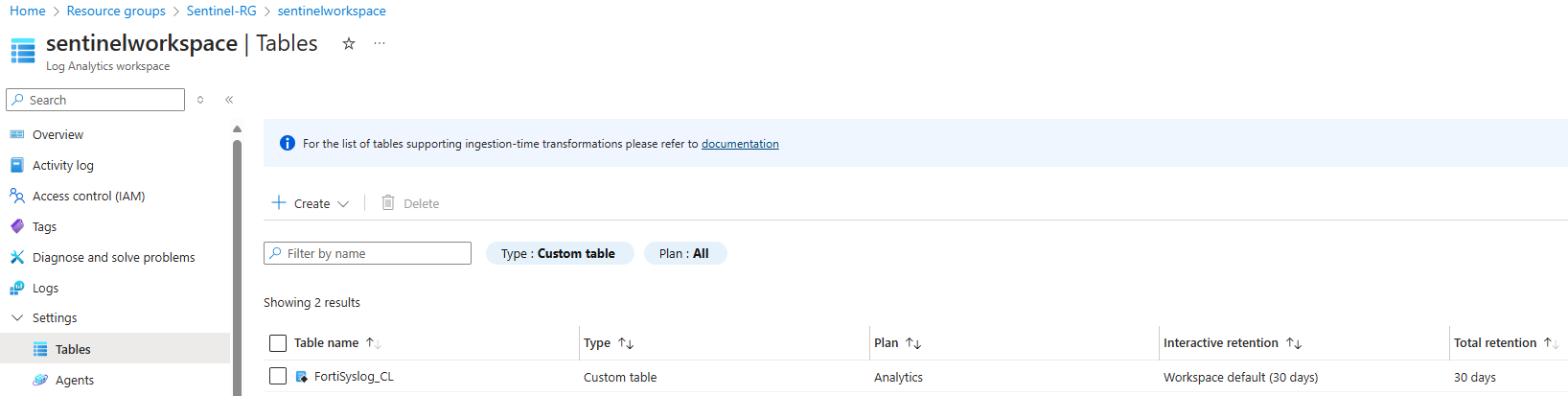 A FortigateSyslog_CL nevű adattábla ahová kerül a Syslog: