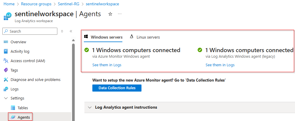 A Sentinel Log Analytics Workspace-nél, az Agent rész alatt látszik, hogy szerverünk megfelelően csatlakoztatva lett.