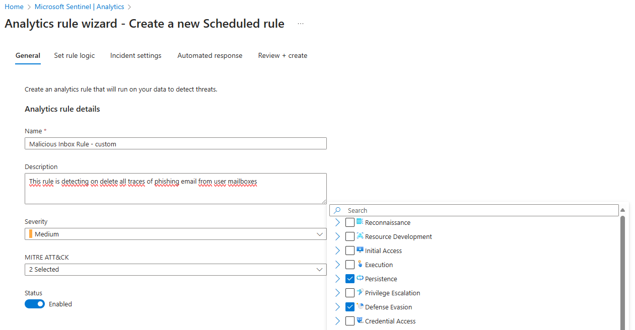 Ez a Custom Analytics Rule egy Exchange Online eseményeket figyelő szabály a Microsoft Sentinelben. Kifejezetten azokra az esetekre koncentrál, amikor egy felhasználó új beérkező levelekre vonatkozó szabályt (New-InboxRule) állít be, amely potenciálisan rosszindulatú e-maileket automatikusan áthelyez a „Deleted Items” vagy „Junk Email” mappába.