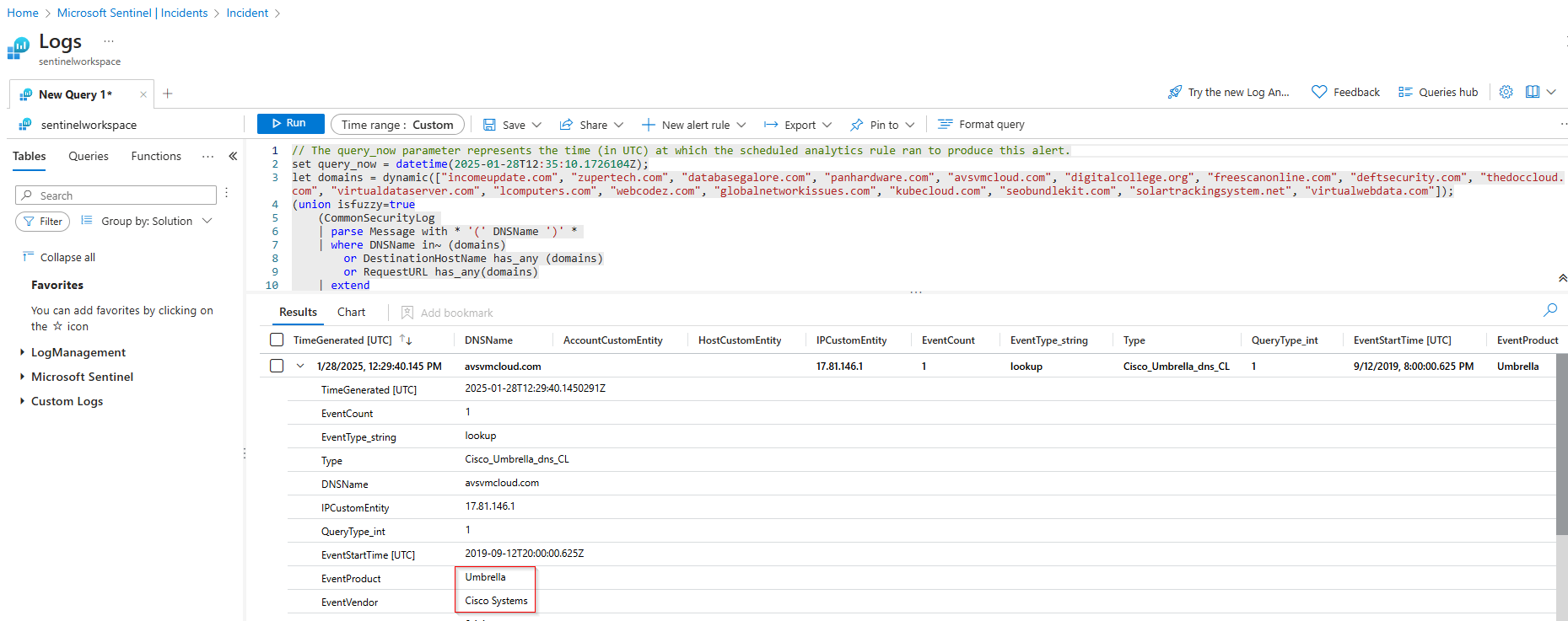 Az ide kapcsolódó további logokat elemzve látszik, hogy az eseményt a Cisco Umbrella küldte be a Sentinel-nek: