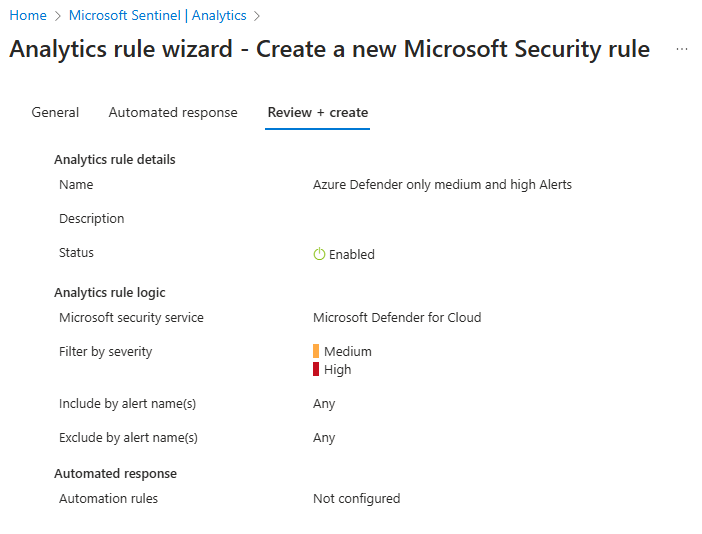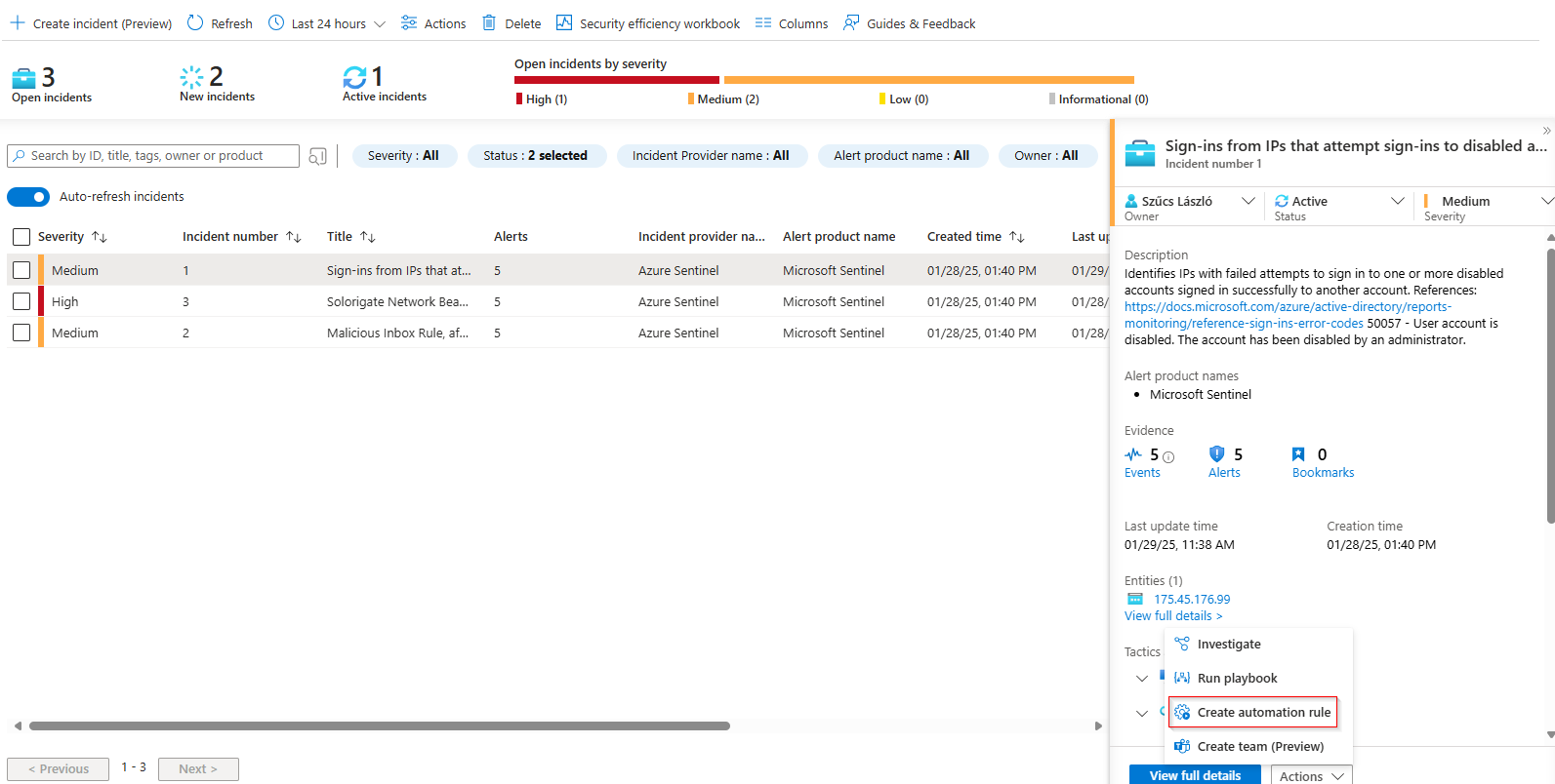 Microsoft Incident Creation Rule készítése – plédául csak a Defender Medium, vagy High alerteket rögzítse