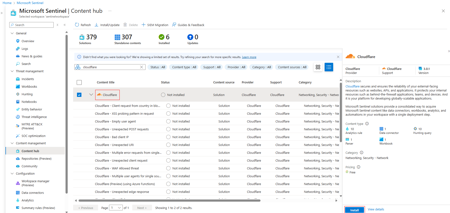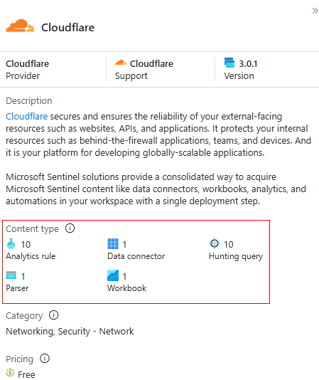 Az integráció telepítésével bekerülnek adatcsatlakozók, analitikai szabályok, hunting lekérdezések, valamint egy vizuális dashboard (workbook) a Cloudflare adatok áttekintésére. Emellett automatizált válaszokat (playbookok) és incidenskezelési eszközöket is biztosít. Ezeket vettük át fentebb. (Csak még egyszer felsorolom őket, mert nekem is időbe telt mire megjegyeztem melyik mire való.)