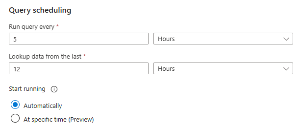 Utána meg kell adni a custom query-t (KQL), és megadni milyen időzítéssel fusson le, az alábbi módon: