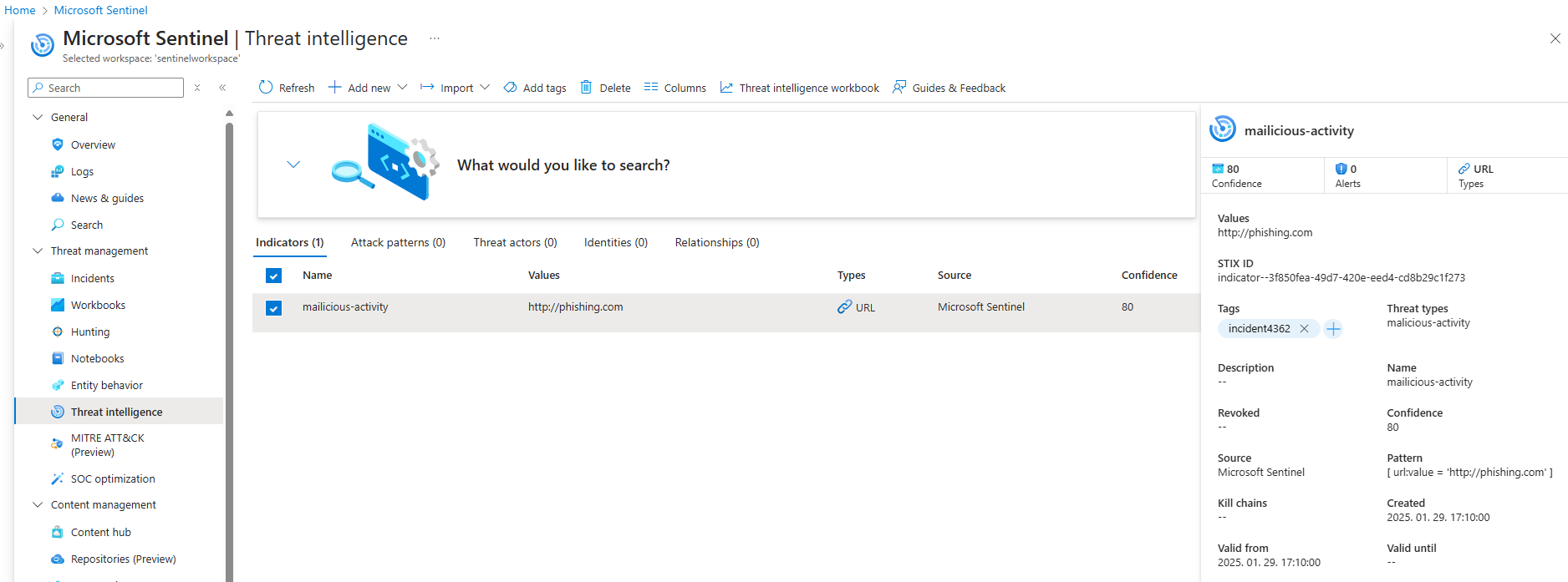 Az elkészült IOC egy TI objektumként (Threat Intelligence Object) rögzítésre kerül: