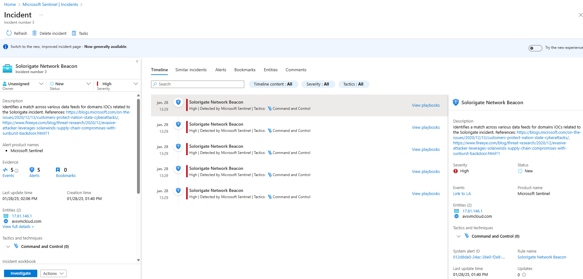 Sentinel incidensnézet, amely egy „Solorigate Network Beacon” riasztást mutat. A riasztás egy magas súlyosságú fenyegetést jelez, amely a Solorigate (SolarWinds supply chain attack) ismert Command and Control (C2) infrastruktúrájához kapcsolódó IP-címeket és domaineket észlelt. Az incidenshez 5 esemény és 5 riasztás tartozik, érintett entitások között szerepel egy IP-cím (17.81.146.1) és egy domain (avsvmcloud.com). Az elemzők kivizsgálhatják az eseményt, playbookokat futtathatnak (például IP-blokkolás vagy értesítés küldése), és szükség esetén izolálhatják az érintett eszközöket.