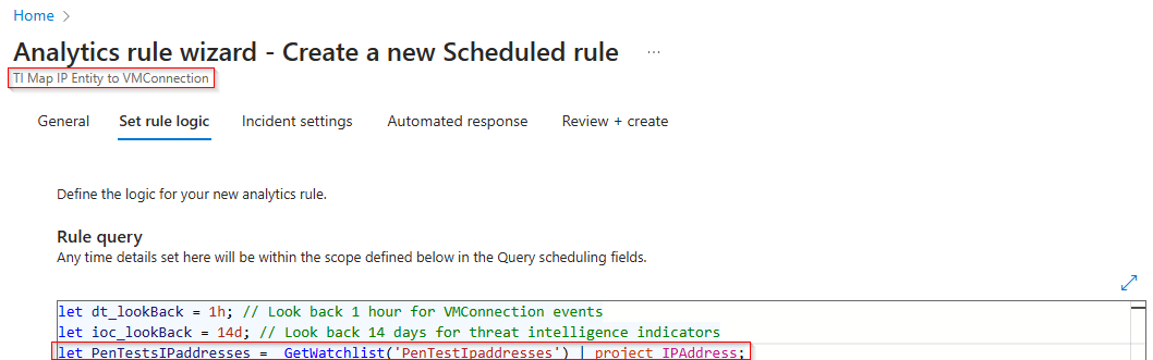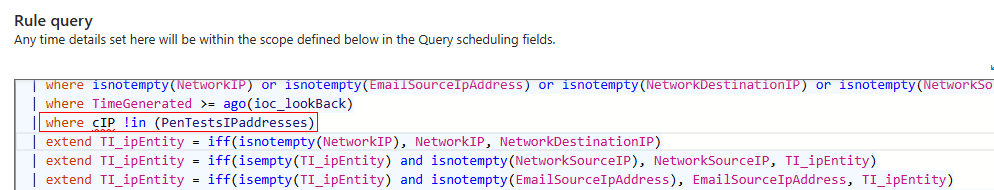 Ez a Sentinel szabály hálózati és e-mail forgalomban lévő IP-címeket vizsgál, összeveti őket egy watchlist-tel, kizárja a listában szereplő IP-ket (pl. PenTest IP-k), majd a gyanús IP-ket entitásként rögzíti további elemzéshez (TI_ipEntity):